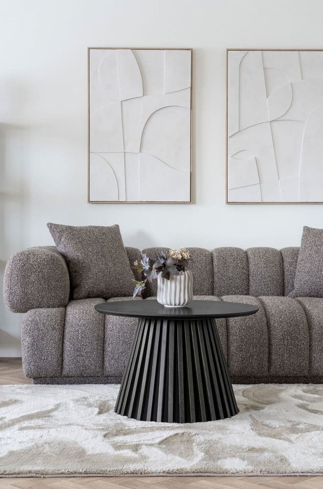 Der elegante Couchtisch „Osaka“ verbindet praktischen Nutzen mit ästhetischem Anspruch. Sein stabiles, konisch geformtes Untergestell aus senkrechten Holzlamellen verleiht ihm eine moderne und zugleich raffinierte Ausstrahlung. Die runde Tischplatte aus dunklem Holz unterstreicht die zeitlose Eleganz und sorgt für Beständigkeit. Durch das geometrische Design des Gestells entsteht ein harmonisches Zusammenspiel von Standfestigkeit und Leichtigkeit. So wird der Tisch zu einem vielseitigen Blickfang – ob im Wohnzimmer, im Büro oder in jedem Raum, der ein stilvolles Statement verdient.