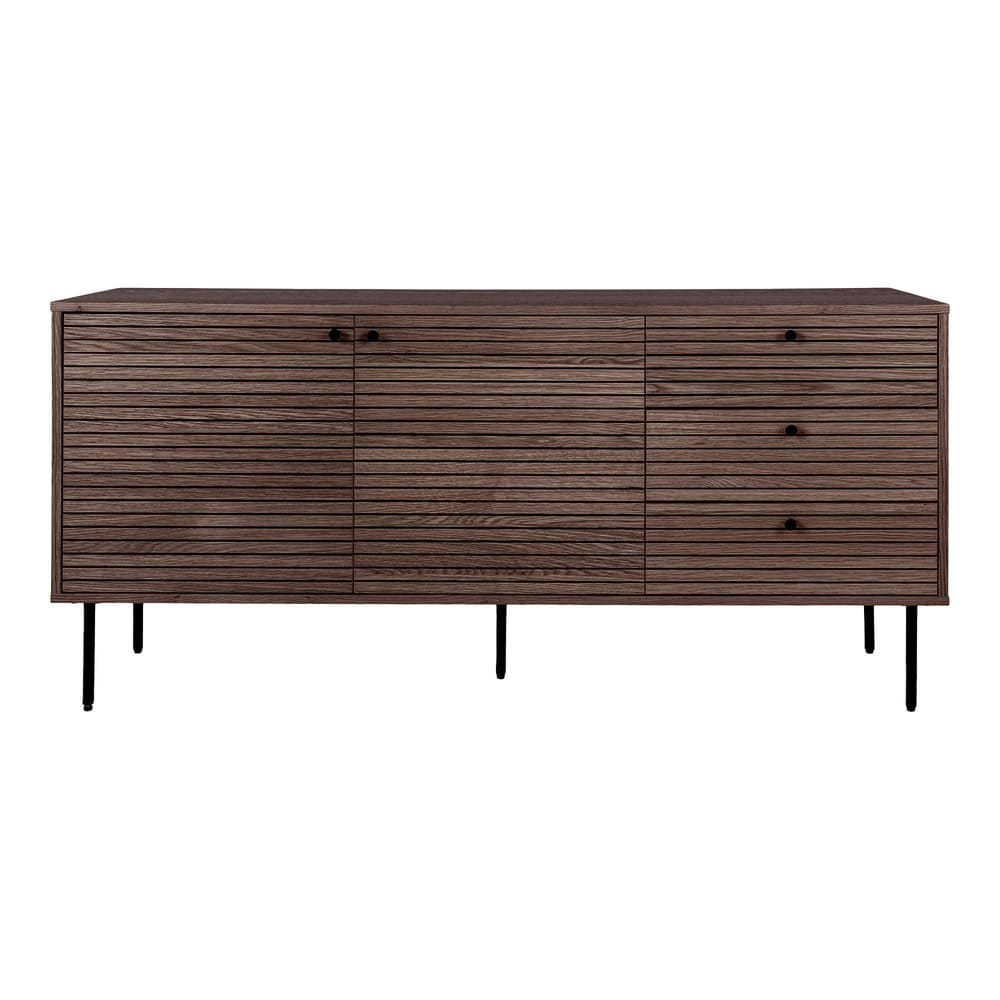 Verleihe Deinem Wohnzimmer mit dem Kyoto Sideboard einen Hauch moderner Eleganz. Dieses stilvolle Sideboard verfügt über drei Schubladen und zwei Türen und bietet ausreichend Stauraum für Deine Sachen. Die Oberfläche aus dunkelbraunem Eichenfurnier sorgt für eine warme und natürliche Note, während die schwarzen Metallbeine für einen modernen Look sorgen.